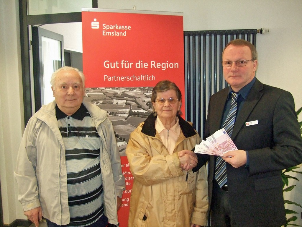Das Ehepaar Erich und Käte Lämmerhardt sind glückliche Gewinner der März-Auslosung der Sparkassen-Lotterie „Sparen+Gewinnen“ der Sparkasse Emsland. Sie gewannen den monatlichen Höchstbetrag von 5 000 Euro, den sich die Gewinner in der Sparkassen-Geschäftsstelle Sögel abholten. Geschäftsstellenleiter Helmut Wöste übergab den Hauptpreis in bar an die glücklichen Gewinner.