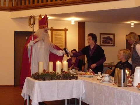 Von der Musikkapelle trugen drei Mädchen schöne Adventslieder auf der Querflöte vor. Nachdem bei Kaffee und Kuchen eine rege Unterhaltung der Teilnehmerentstand, war der Nikolaus zu Gast. Er fand nette Worte zur Advents- und Weihnachtszeit und konnte dann 40 Teilnehmern über 80 Jahre alt ein kleines Geschenk überreichen. Gemeinsam gesungene Adventslieder wurden von den 7 Musikern aus Sögel begleitet.