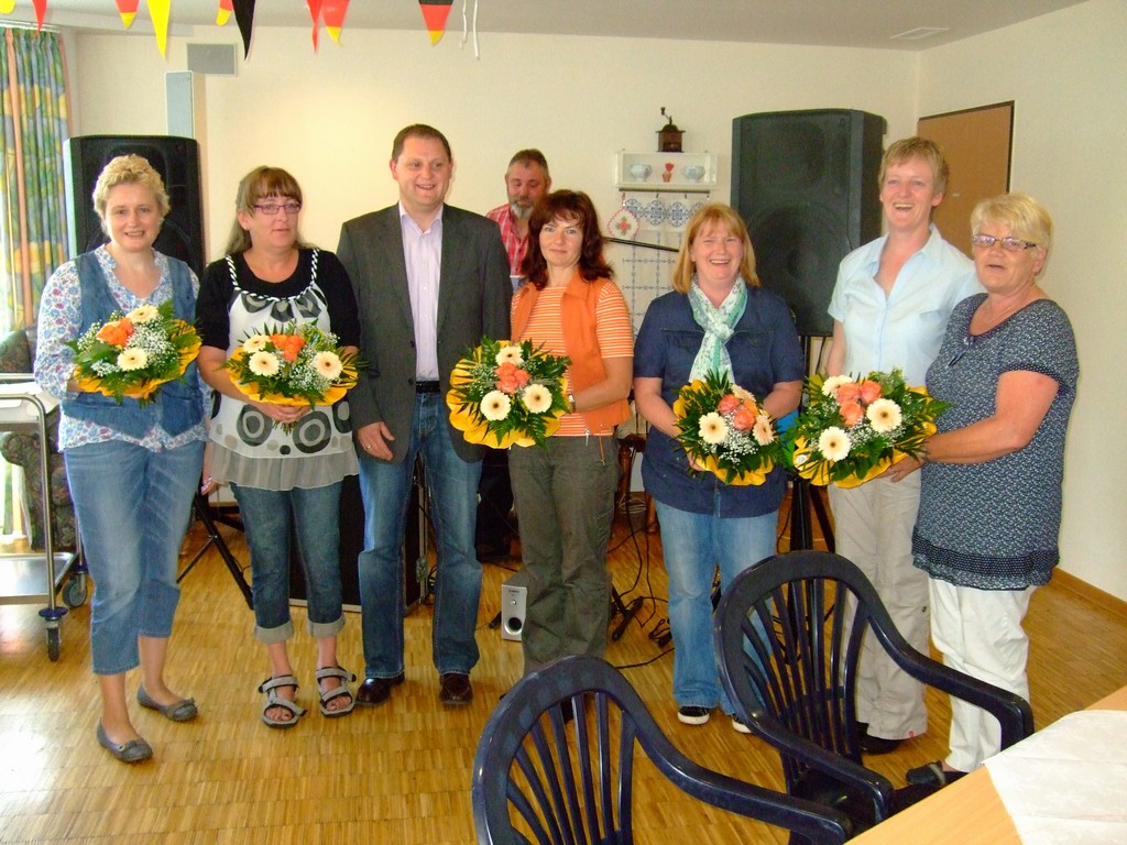 1. August 2011Das Seniorenheim Haus Simeon in Lathen feierte am 1. Juli sein Jahresfest. Eingeladen waren neben den Angehörigen und Freunden auch die Bewohner aus dem Haus Simeon in Sögel. Den musikalischen Rahmen gestaltete Heinz Mächler am Keyboard, der sich mit seinen Liedern ganz auf die Festgesellschaft eingestellt hat. So lautete auch das Motto „Schlager aus den 50er Jahren“. Mit ausgesuchten Unterhaltungsspielen eroberten die Mitarbeiterinnen schnell die Herzen der Senioren. Wie bei diesen Anlässen üblich wurden die, in diesem Fall Mitarbeiterinnen, die 10 – bzw. 15 Jahre im Haus waren, geehrt.- siehe Foto –