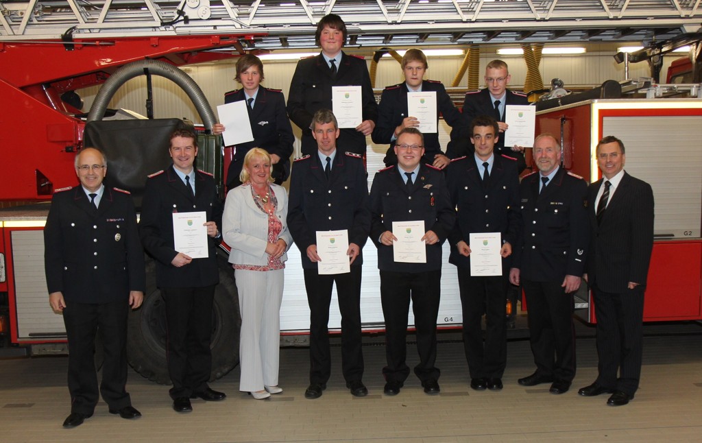 Unser Foto zeigt von links: Erster Stellvertretender Ortsbrandmeister Lambert Brand, Ortsbrandmeister Frank Tholen, Christian Lammers, Bürgermeisterin Irmgard Welling, Heiko Künnen. Johannes Lammers, Dennis Meyer, Tim Schlobinski, Rene Kabey, Kevin Rackowitz, Gemeindebrandmeister Hermann Weller und Erster Samtgemeinderat Hans Nowak.