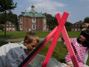 Unter dem Motto „Wir bauen ein Schloss“ steht diese ganz im Zeichen der Grundsteinlegung von Schloss Clemenswerth. Vier Tage lang erschaffen Jungen und Mädchen ein großes buntes Gesamtkunstwerk, ebenso wie die vielen Handwerker um den Architekten Johann Conrad Schlaun vor 275 Jahren. U.a. werden Holznägel hergestellt und kleine Schlossmodelle gebastelt. Am Ende der Kinderferienwoche am Samstag, dem 28.07., werden die Meisterwerke feierlich Eltern, Verwandten und allen Interessierten präsentiert. Kinder können die ganze Woche teilnehmen (24 € / Woche) oder nur an einzelnen Tagen mit basteln (6 € / Tag). Zwei weitere Angebote haben ebenfalls das große Schlossjubiläum zum Thema: