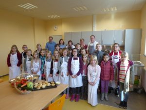 In diesem Jahr setzten sich die Schüler/innen mit den Themen „Ernährung“ und „Gute Tischmanieren“ auseinander. In der Küche der Grundschule kochten sie gemeinsam mit dem Essenszulieferer Norbert Moorkamp zum Thema „Herbstliches Gemüse“ das Mittagessen für die Kinder der Ganztagsschule. Einerseits war es Ziel dieser Aktion, die Kinder an hauswirtschaftliche Arbeiten heranzuführen, zum anderen machten die Kinder Bekanntschaft mit vielen herbstlichen Gemüsesorten wie z.B. Steckrüben, Kürbis, Zucchini. Eigenständiges Arbeiten wie selbst einen Kürbis auszuhöhlen, daraus eine Suppe zu kochen und diese in der Kürbishülle zu servieren, ist schon etwas Besonderes.