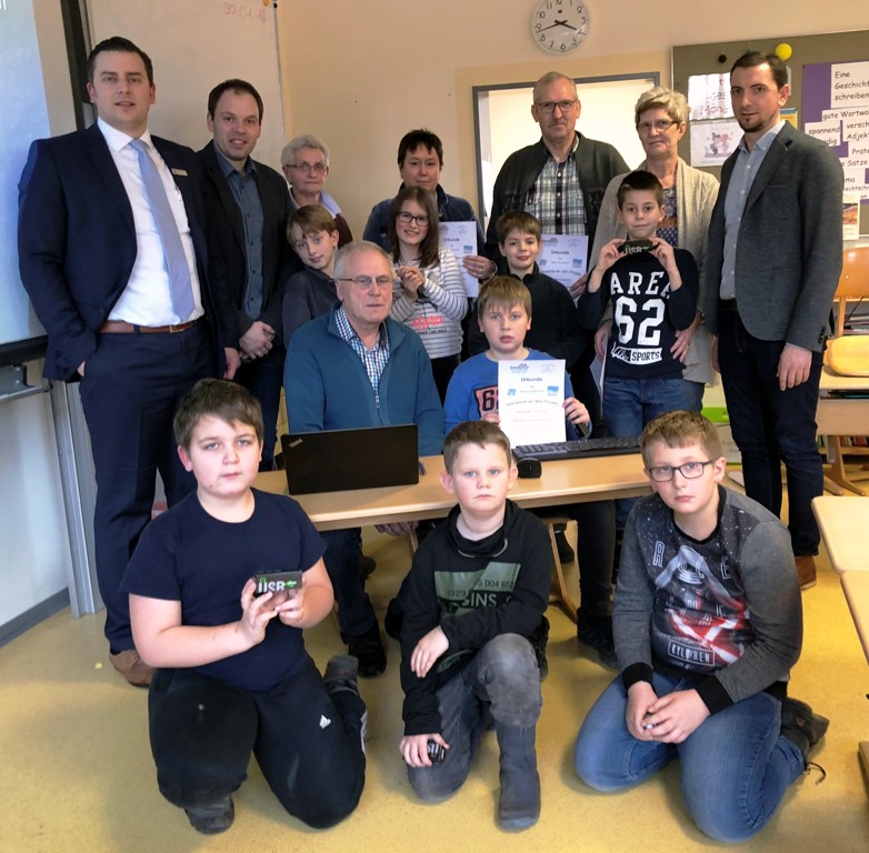 Die Senioren erhielten von der projektleitenden Lehrkraft Dimitri Gappel und Schulleiter Matthias Wraga ein Zertifikat, das ihnen erste PC-Kenntnisse bestätigt. Zur Belohnung gibt es für die „Lehrer“ je einen USB-Stick und für die „Schüler“ einen Kugelschreiber aus den Händen von Matthias Rode von der Kreissparkasse Emsland aus Sögel, die das Projekt finanziell unterstützt.