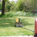 Zwei weitere Höhepunkte gab es zum Schluss des Besuchs: Die Kinder und auch die Klassenlehrerinnen durften selbst ein Strahlrohr in die Hand nehmen und ein kleines „Brandhaus“ löschen. Die Befehle „Wasser marsch“ und „Wasser halt“ waren schnell verstanden. Hoch interessant war eine Vorführung, bei der eine Spraydose, die mit einem speziellen Übungsgerät der Feuerwehr Sögel großer Hitze ausgesetzt wurde, mit einer Stichflamme und lautem Knall explodierte. Die Feuerwehrleute ermahnten die Kinder zum vorsichtigen Umgang mit Feuer und Brandquellen.