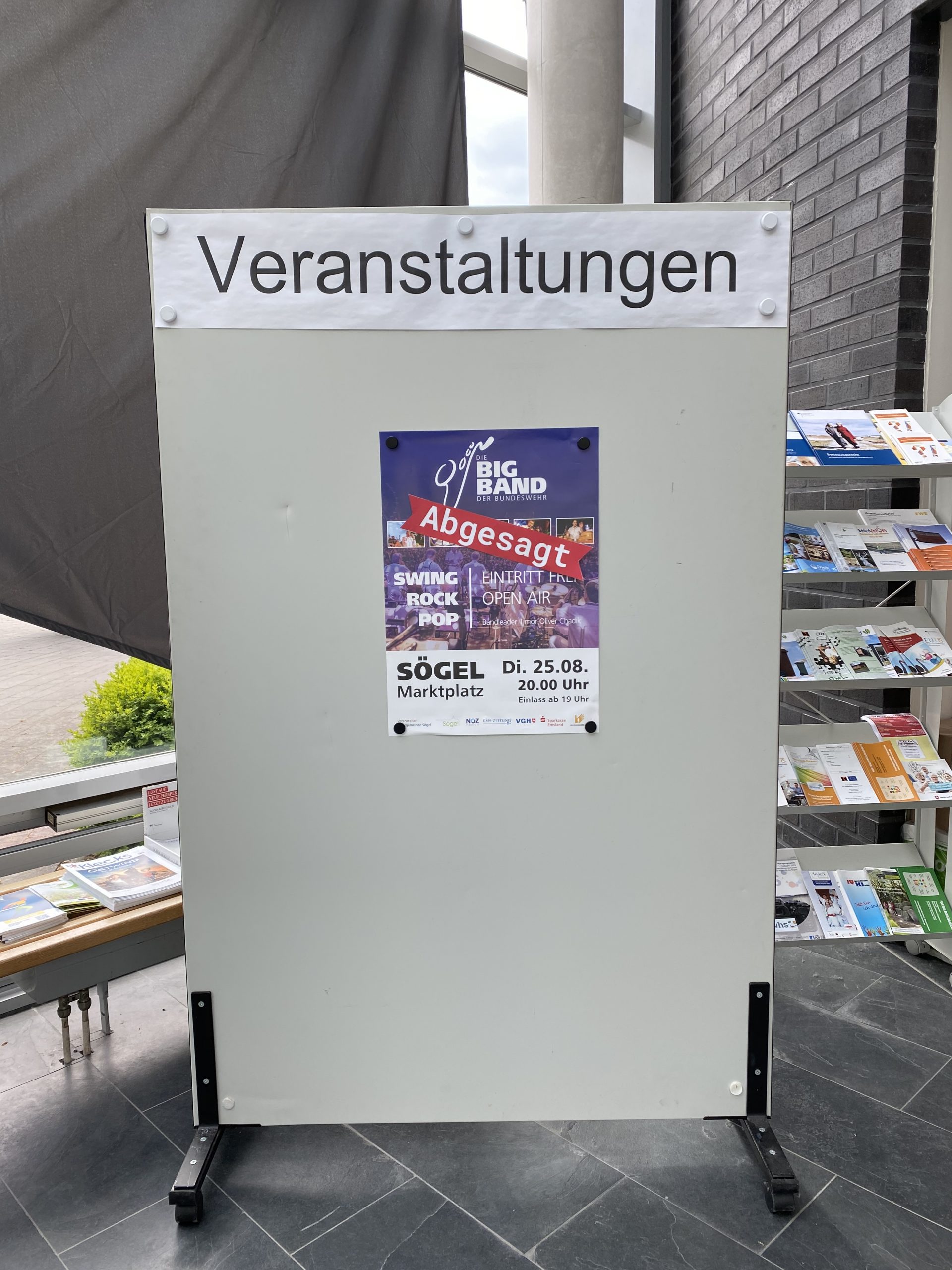 13. Juli 2020Sögel – Die Vorfreude war groß. Am 25. August sollte die Big Band der Bundeswehr in Sögel auf dem Marktplatz ein Konzert geben. Dieses muss nun aufgrund der Corona-Pandemie und den damit verbundenen Verhaltensregeln abgesagt werden. „Wir bedauern dies außerordentlich. Wir hatten uns schon sehr auf dieses Event, welches zugunsten von Helping Hands stattfinden sollte, gefreut. Doch die Gesundheit aller geht vor“, sagt Günter Wigbers, Samtgemeindebürgermeister. Die Samtgemeinde Sögel bemüht sich jetzt, schnellstmöglich einen Ersatztermin für das kommende Jahr zu bekommen.