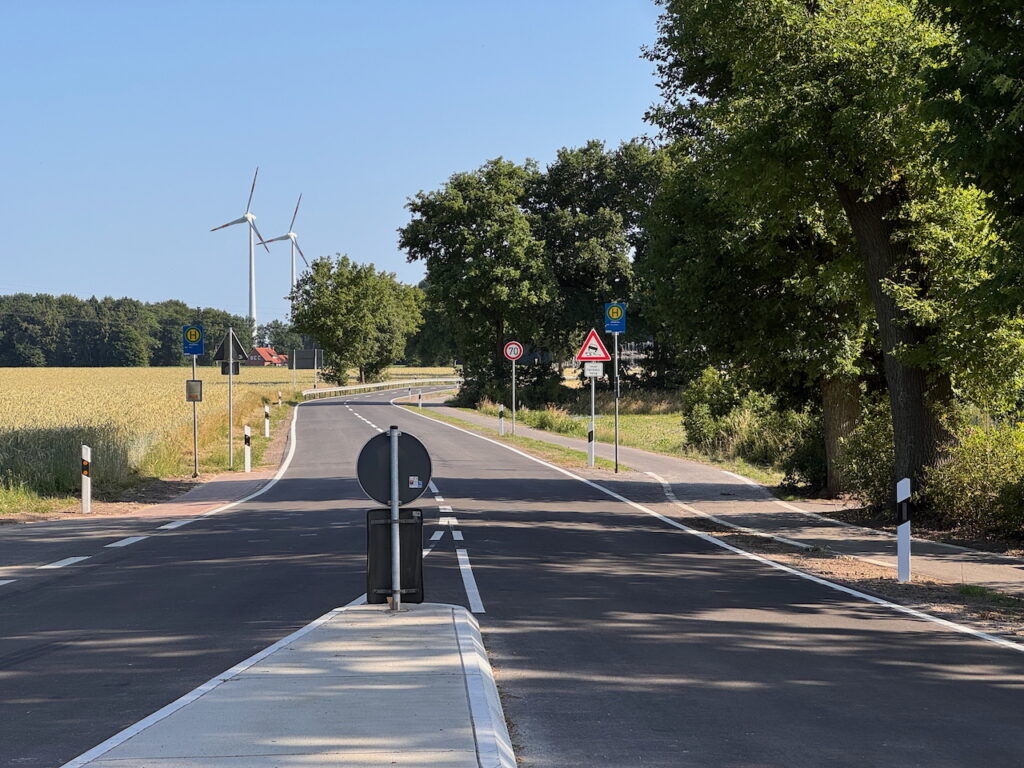 Ein großes Ärgernis war auch der zuletzt sehr „holprige“ Radweg, der viel genutzt wird. Nach der Sanierung befindet sich auch der verbreiterte Radweg jetzt in einem optimalen Zustand. In Hüven und Eisten ermöglichen jetzt Fahrradpiktogramme die Nutzung der Hauptfahrbahn, wo ein Ausbau des Radweges nicht möglich war.
