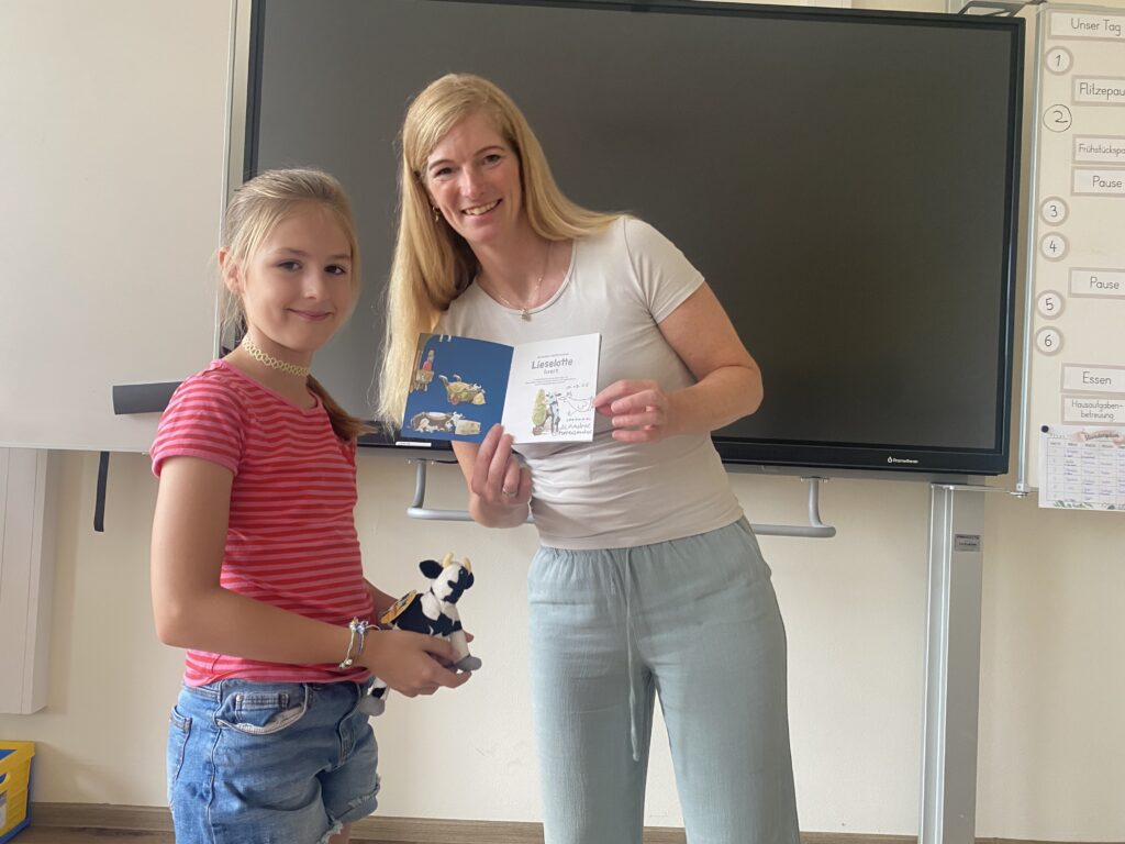 26. Oktober 2025Börger – Kinder der Grundschule Börger wurden kreativ: Die Arbeitsgruppe „Platt is cool“ rief kurz vor den Sommerferien in ganz Niedersachsen zu einem Malwettbewerb auf, an der die Grundschule Börger mit Freude teilnahm und freudigerweise viele sehr kreative Bilder der Kinder einreichen konnte. Motiv des Wettbewerbes war die Kuh Lieselotte, die den Postboten von ihrem Hof jagt. Die Szene ist gleichzeitig das Leitmotiv aus dem Buch „Liselotte luurt“ von Alexander Steffensmeier, dem ersten Band der Liselotte-Reihe.