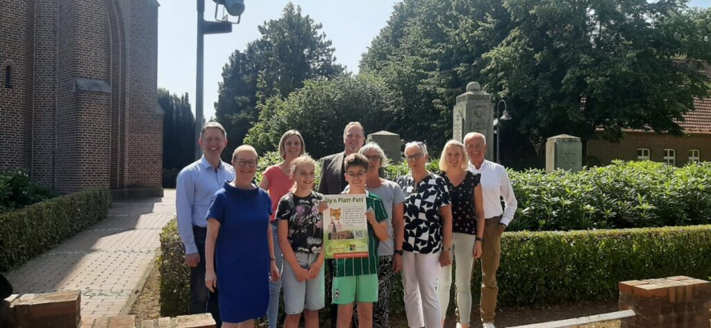 Am 11.08.2025 war es dann endlich so weit. Die Platt-Patt Plakette wurde im Beisein von Vertretern der Schule, Kirchengemeinde, Gemeinde und der Fachstelle Plattdeutsch – „Emsländische Landschaft“ entgegengenommen und soll zeitnah vor der Kirche angebracht werden. Der Film ist dann mittels QRCode abrufbar.