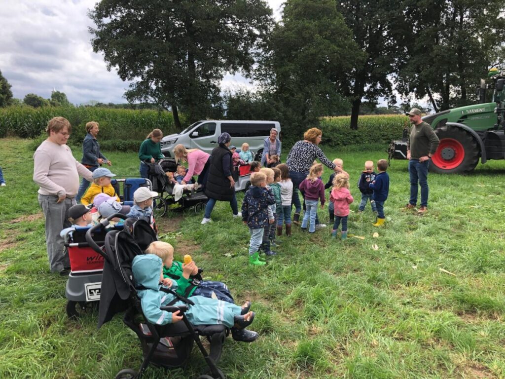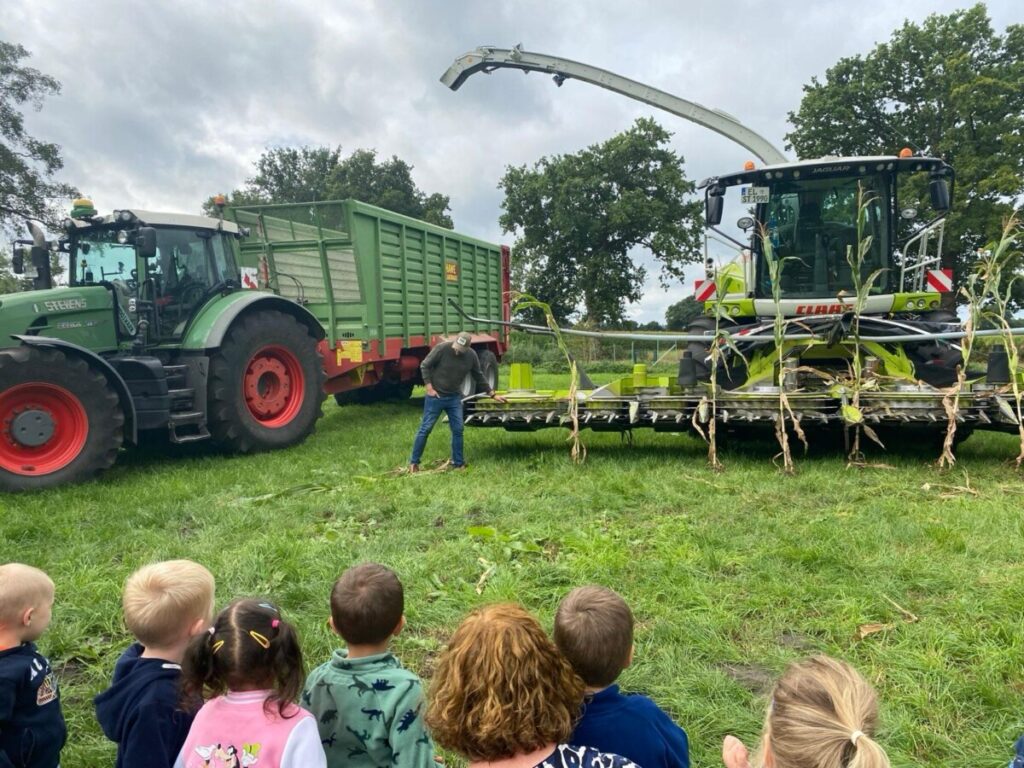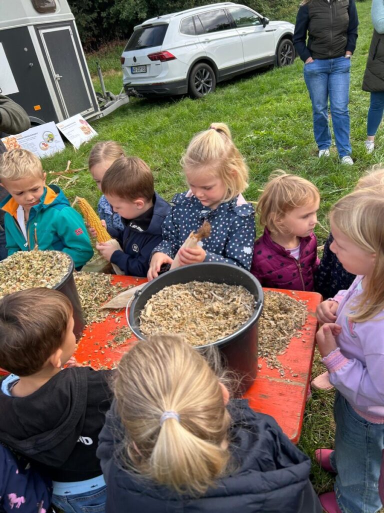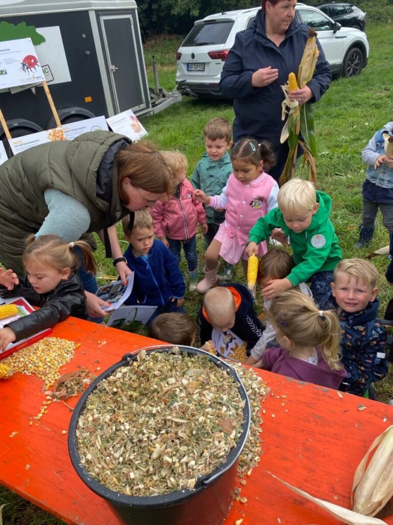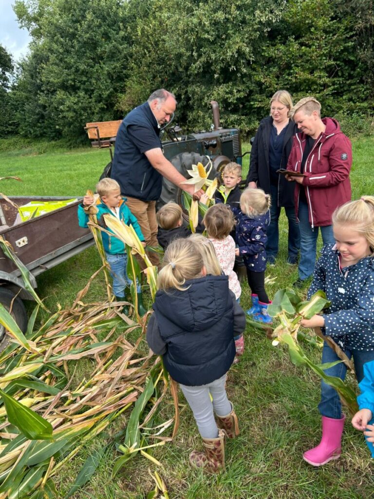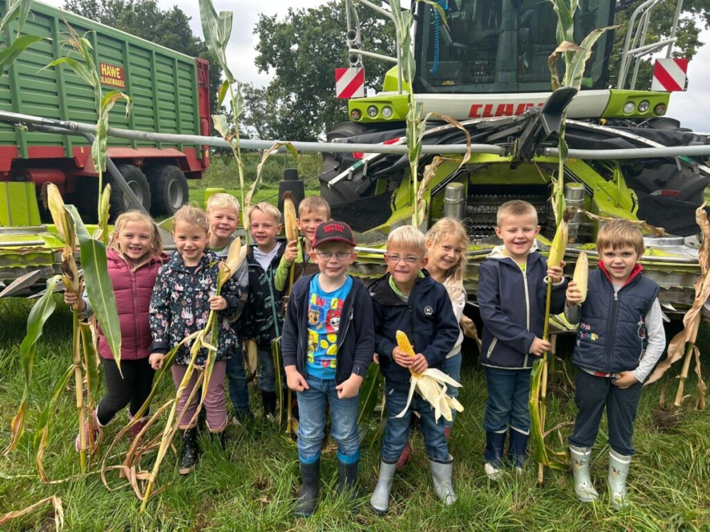 Schon der Weg dorthin war aufregend, denn auf der Wiese warteten nicht nur der beeindruckende Maishäcksler, gefahren von Heinz Hanekamp, sondern auch ein großer Trecker mit Anhänger und viele frische Maispflanzen, die es zu entdecken galt. So konnten die Kinder hautnah erleben, wie hoch eine Maispflanze wirklich ist und wie moderne Landwirtschaft funktioniert.