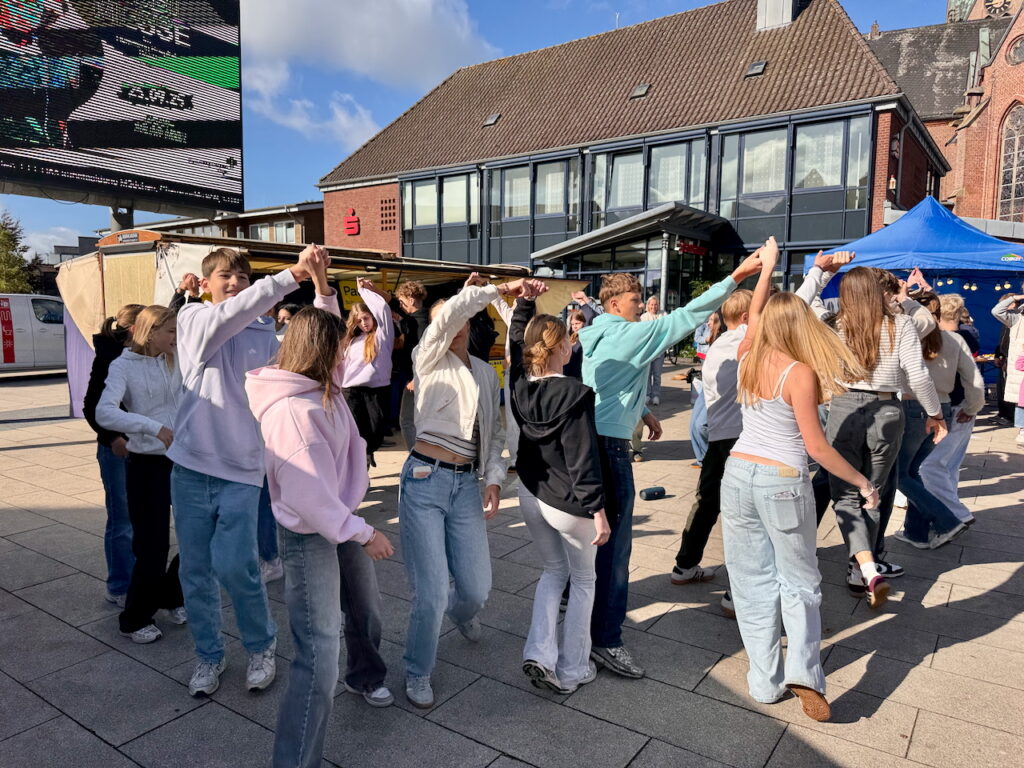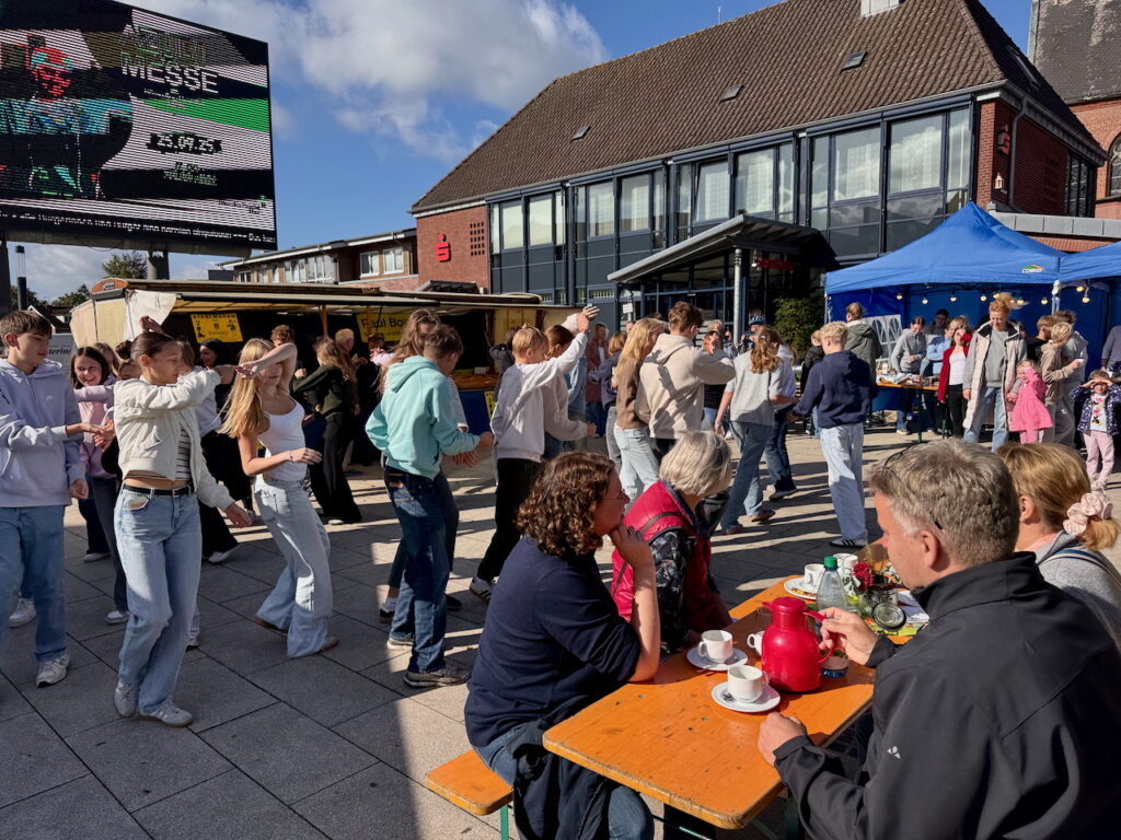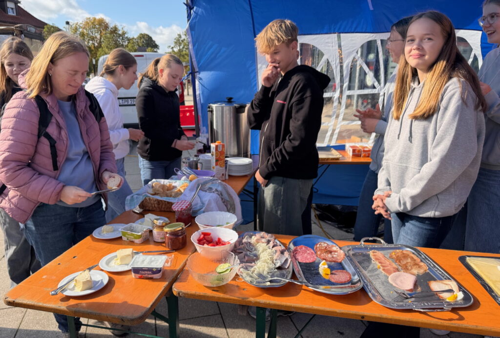 Sögel – Unter dem Motto „Fair handeln – Vielfalt erleben“ fand auf dem Sögeler Marktplatz das beliebte Faire Marktfrühstück statt – ein gelungener Auftakt zur bundesweiten Fairen Woche 2025, wie viele Besucher feststellten. Die Veranstaltung war ein gemeinschaftliches Projekt der Steuergruppe Fairtrade Town Sögel, des Weltladens Sögel und des Hümmling-Gymnasiums, unterstützt von Rosi Hölscher von der Kirchengemeinde St. Jakobus und Marktleiter Paul Bongart. Neben einem reichhaltigen Frühstücksangebot aus fair gehandelten und regionalen Produkten – darunter Baguettes von Anneken aus Werpeloh, Käse, Aufschnitt, Fisch, Marmelade, Honig, Eier, Gemüse sowie Tee, Kaffee und Orangensaft aus dem Weltladen – sorgte auch das sonnige Herbstwetter für eine rundum angenehme Atmosphäre. Auch Aufstriche, Snacks und Bananenbrot standen zur Verkostung bereit, während Kinder aus dem Familienzentrum St. Jakobus mit ihrem eigenen kleinen Weltladenstand großen Erfolg hatten. Ein besonderer Höhepunkt war der Besuch der Austauschschülerinnen und -schüler aus Schweden, Polen und Slowenien, die zusammen mit ihren deutschen Gastgebern durch traditionelle Tänze und kulinarische Beiträge – wie selbstgebackene schwedische Nussecken – das Motto „Vielfalt erleben“ auf eindrucksvolle Weise mit Leben füllten. Die Besucherinnen und Besucher konnten sich zudem an verschiedenen Infoständen informieren: Die Katholische Erwachsenenbildung und die Initiative „Omas gegen rechts“ waren ebenso vertreten wie engagierte SchülerInnen des Hümmling-Gymnasiums, die ein faires Quiz mit kleinen Preisen sowie eine Umfrage zur Frage „Was bedeutet Vielfalt für dich?“ durchführten. Das Faire Marktfrühstück erzielte auch einen sozialen Mehrwert: Durch freiwillige Spenden kam ein beachtlicher Überschuss zusammen. Dieser wird an eine Vorschule in Rajasthan, Indien, gespendet, um die Kinder von Steinbrucharbeitern zu unterstützen. Die Organisatoren zeigten sich sehr zufrieden mit der Veranstaltung und dem großen Interesse der Bevölkerung: „Es war eine wunderbare Gelegenheit, fairen Handel und kulturelle Vielfalt im Alltag erlebbar zu machen“, so das Fazit von Diana Schmitz und der Steuergruppe.