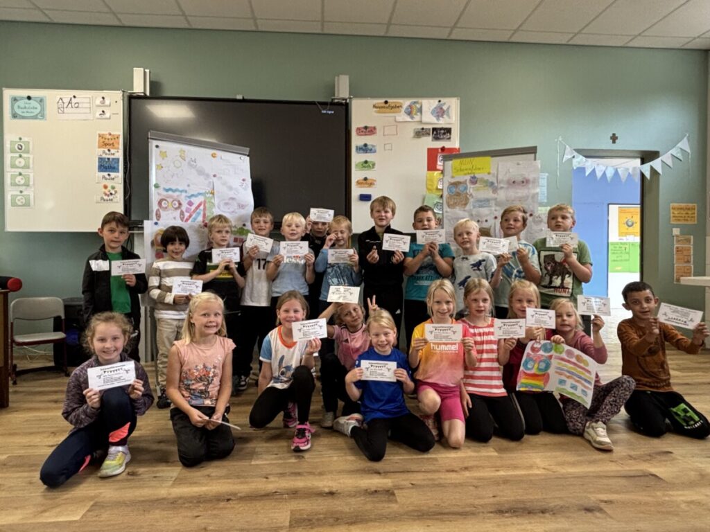 1. November 2025Spahnharrenstätte – Die Klasse 1 hat erfolgreich den Scherenführerschein gemacht. Mit viel Konzentration und Freude schnitten die Kinder Eulen, Raupen, Raketen sowie verschiedene Formen und Figuren aus. Dabei konnten sie zeigen, wie geschickt sie mit der Schere umgehen können. Am Ende des Tages waren alle sehr stolz auf ihre tollen Ergebnisse – und natürlich auf ihren neuen “Führerschein”!