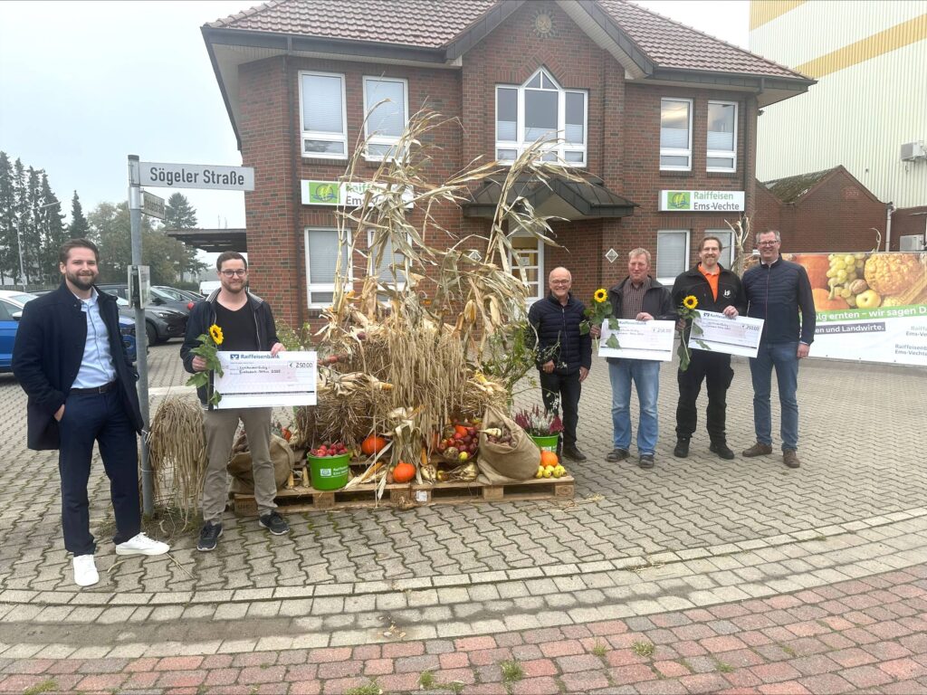 Insgesamt 1.500 Euro spendete die Raiffeisenbank Ems-Vechte eG an sechs gemeinnützige Vereine aus der Region. Die Vorschläge dafür kamen aus der Belegschaft. Zur genossenschaftlichen DNA gehört nicht nur die Verwurzelung mit der eigenen Region, sondern auch die Mitbestimmung. Deshalb konnten Mitarbeiter für die Erntedank-Aktion der Raiffeisenbank Ems-Vechte eG mit dem Warengeschäft Raiffeisen Ems-Vechte in der hauseigenen Mitarbeiter-App ihre Vorschläge einreichen. Aus der Vielzahl an Vorschlägen wurden dann sechs gemeinnützige Institutionen per Losverfahren vom Betriebsrat gezogen. Unter dem Motto „Gutes säen, Erfolg ernten – wir sagen danke“ möchte die Raiffeisenbank Ems-Vechte eG der Region etwas zurückgeben. So spendete das Unternehmen jeweils 250 Euro an sechs gemeinnützige Vereine aus der Region, also insgesamt 1.500 Euro. Zu den Spendenempfängern gehören das Zeltlager-Team SV Werpeloh e. V., der Förderkreis Freibad Berßen, Helping Hands e. V. Lathen, die Jugendfeuerwehr Laar, die Inklusionsgruppe „Unlimited Kids“ – ASC Grün-Weiß Wielen e.V. sowie die Ambulante Kinderhospizhilfe Grafschaft Bentheim. Die Raiffeisenbank Ems-Vechte eG bedankt sich in diesem Zusammenhang außerdem bei den eigenen Auszubildenden und Betriebsräten, die für die Aktion eigens Erntedank-Bereiche in Klein Berßen und Laar liebevoll gestalteten.