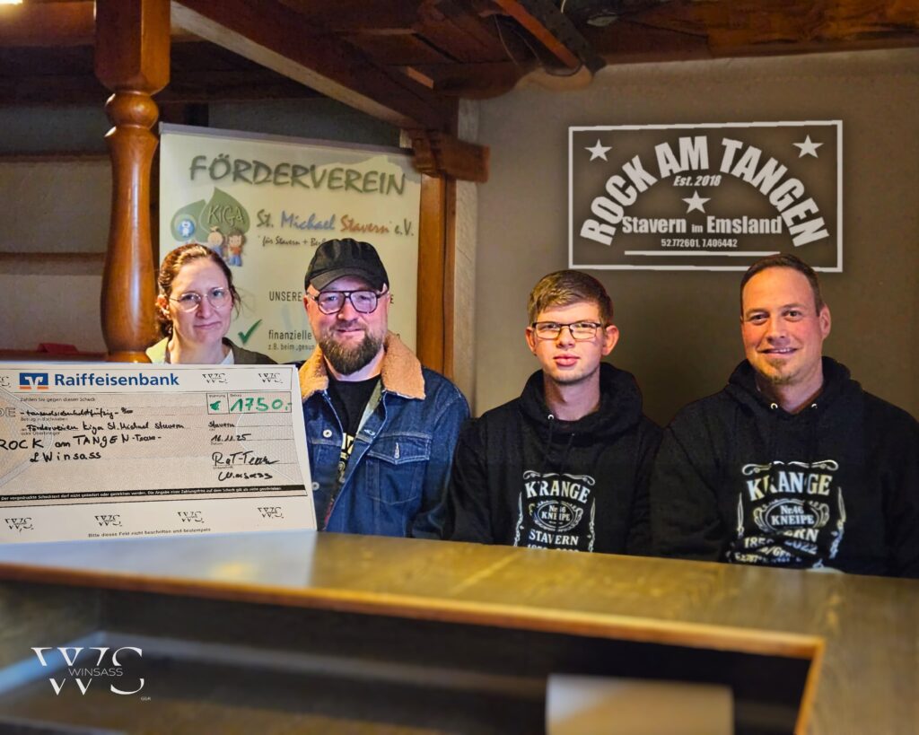 13. Januar 2026Stavern – Beim Staverner Schützenfest an der Theke hatten Michael Möller, einer der Organisatoren des Rock am Tangen und Matthias Niers vom Unternehmen WinSass die Idee, Merch mit einem KRANGE-Logo zu verkaufen. Der Erlös geht komplett als Spende zum Förderverein des Kindergartens St. Michael Stavern und an das Zeltlagerteam. Rock am Tangen steuerte das Logo bei und kümmerte sich um die Bestellungen. Heinz Mödden von Wood World versah Flaschenöffner und Schlüsselanhänger mit dem Logo. So sind 2.200 € zusammengekommen, die WinSass um 500 € auf 2.700 € aufstockt. Rita Kubath, Kassenwartin des Fördervereins bedankt sich im Rahmen der Spendenübergabe bei den Organisatoren der Aktion. Hintergrund: Das alte Gasthaus KRANGE in Stavern wurde betrieben bis 2022. Im Oktober 2025 gab es eine Abschlussfeier in den Räumlichkeiten, organisiert von WinSass. Das Logo zeigt die GPS-Daten und Hausnummer von KRANGE im Jahr 1850. Damals gab es noch keine Straßennamen.