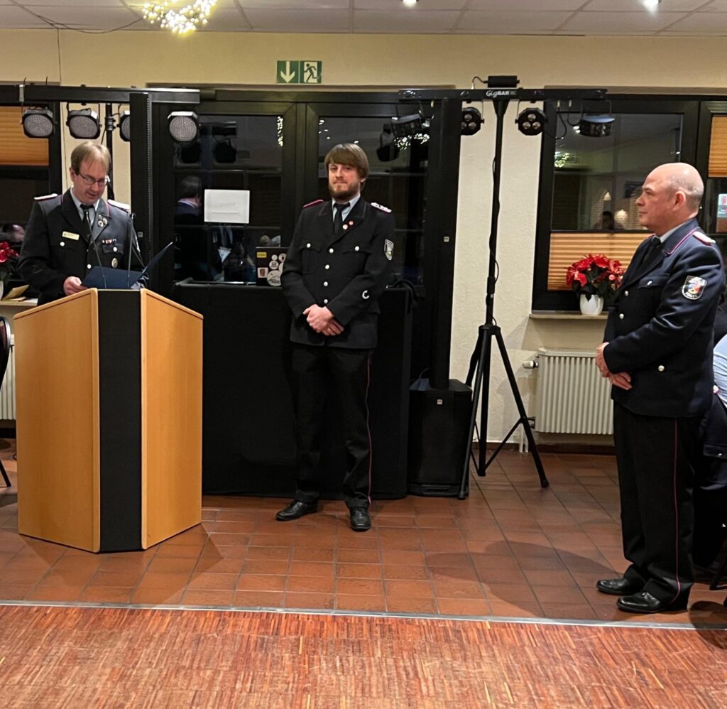 Kreisbrandmeister Holger Dyckhoff überbrachte die Grüße des Landkreis Emsland und der Kreisfeuerwehr. Er dankte allen Einsatzkräften für ihre Arbeit. In seinem Grußwort erläuterte er, dass die neuen Dienstgrade, welche sich nach der neuen Feuerwehrverordnung ergeben, Zug um Zug in den örtlichen Feuerwehren eingeführt werden. Die Umstellung soll Ende 2026 abgeschlossen sein. Durch die Umstellung wird eine Angleichung an die Dienstgrade der Berufsfeuerwehr erreicht. Im Anschluss an sein Grußwort ehrte Dyckhoff den 1. Hauptfeuerwehrmann Thomas Werber für seine 40-jährige aktive Mitgliedschaft in der Freiwilligen Feuerwehr Sögel mit dem Ehrenzeichen der Niedersächsischen Feuerwehr.