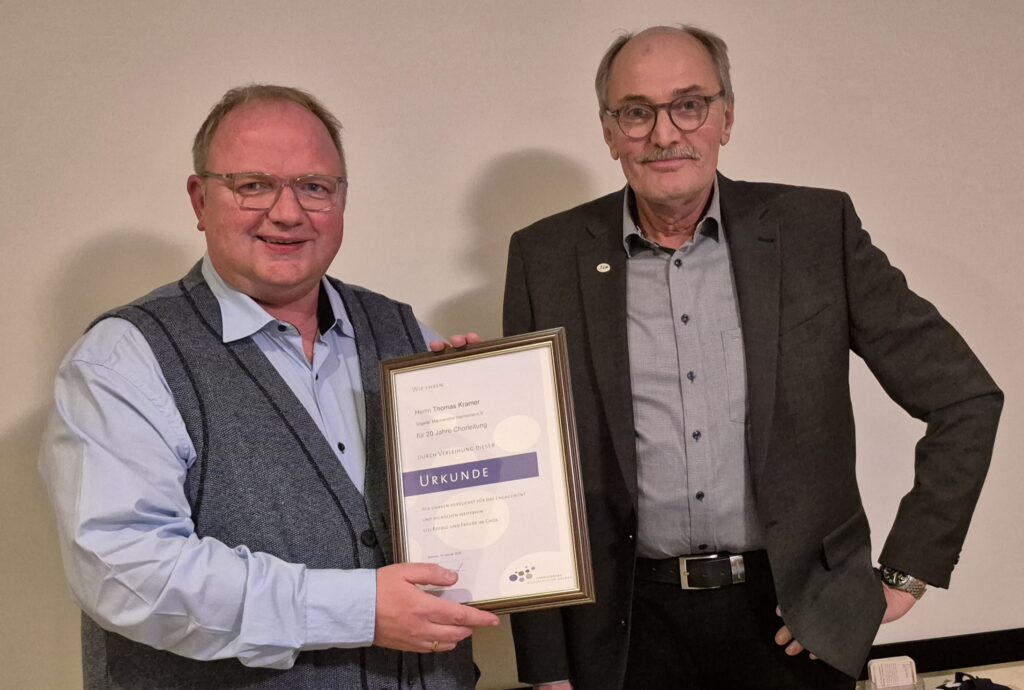 Im Namen des KreisChorVerbandes Emsland – Grafschaft Bentheim nahm dessen Vorsitzender Georg Sewerin Ehrungen vor. Dirigent Thomas Kramer wurde für seine 20-jährige Tätigkeit als Chorleiter ausgezeichnet. Eine weitere besondere Ehrung galt Bernhard Vagedes für 75 Jahre aktives Singen. Vagedes konnte an der Versammlung leider nicht persönlich teilnehmen.