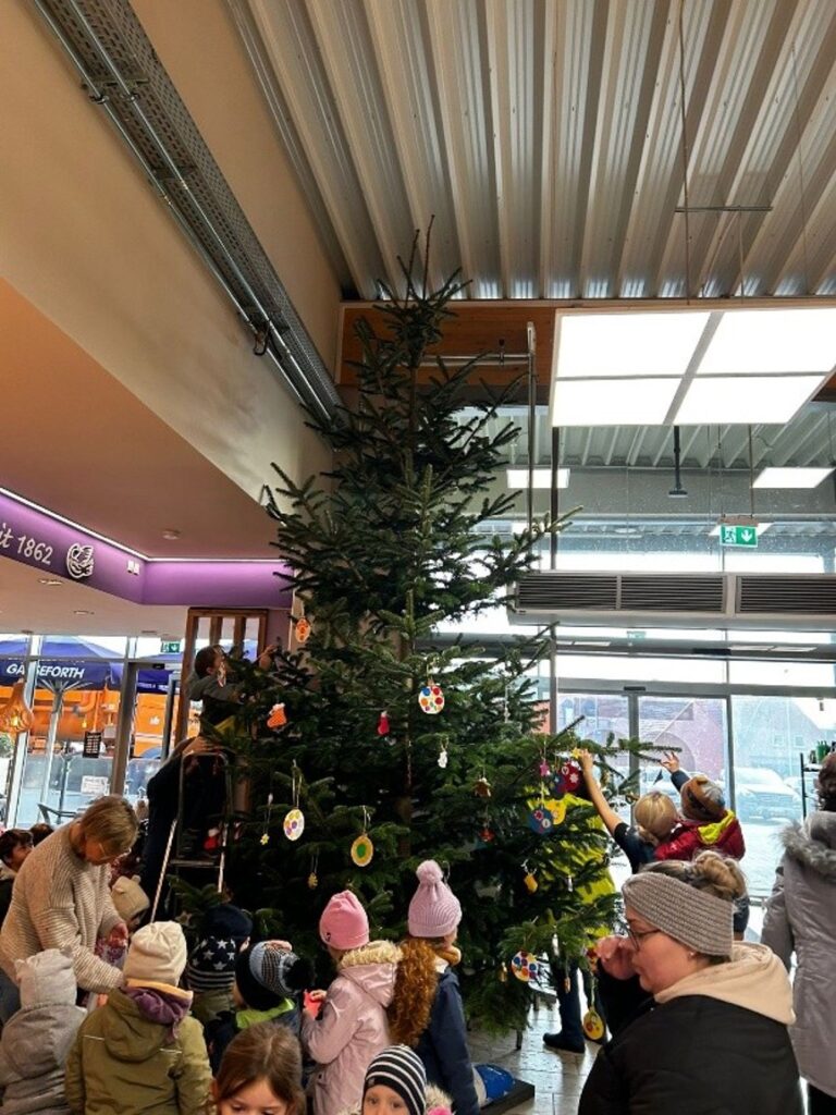 1. Februar 2026Sögel – Auch in diesem Jahr durften wir wieder bei unserem Kooperationspartner, dem EDEKA – Markt in Sögel, den großen Tannenbaum im Eingangsbereich schmücken. Mit allen Kindern der KiTa Arche Noah (ca. 80 Kinder an diesem Tag) machten wir uns mit gebasteltem Baumschmuck auf den Weg. Wir mussten auf eine Leiter steigen, um den Baumschmuck anzubringen. Nicht nur die Kinder waren begeistert, auch die Kunden klatschten Beifall, als alle Kinder die Lieder: Tipp, tapp, erster Advent… und Sternenfänger gesungen haben. Als Dankeschön bekam jedes Kind einen Schokololli von Marko Meyer und seinem Team überreicht. Schöne Weihnachten euch allen und bis zum nächsten Jahr!