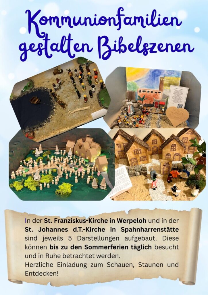 1. März 2026Spahnharrenstätte/Werpeloh – Mit viel Engagement, Kreativität und Herz haben die Erstkommunionfamilien aus Spahnharrenstätte und Werpeloh jeweils in ihren Kirchen fünf Bibelgeschichten aufgebaut. Jeweils zwei bzw. drei Familien haben sich intensiv mit einer biblischen Erzählung auseinandergesetzt und diese auf ganz unterschiedliche Weise zum Leben erweckt. Mit vielfältigen Figuren, Materialien und Ideen sind eindrucksvolle Darstellungen entstanden, die zum Innehalten, Staunen und Nachdenken einladen. Ein herzliches Dankeschön gilt allen beteiligten Familien, die Zeit, Mühe und Fantasie investiert haben. Ihr Einsatz macht die Bibelgeschichten auf anschauliche Weise erfahrbar. Die liebevoll gestalteten Darstellungen können in den kommenden Wochen und Monaten in den kath. Kirchen in Spahnharrenstätte und Werpeloh besichtigt werden. Die Erstkommunionfamilien laden herzlich dazu ein, sich Zeit zu nehmen, die einzelnen Szenen zu betrachten und die biblischen Geschichten neu zu entdecken.
