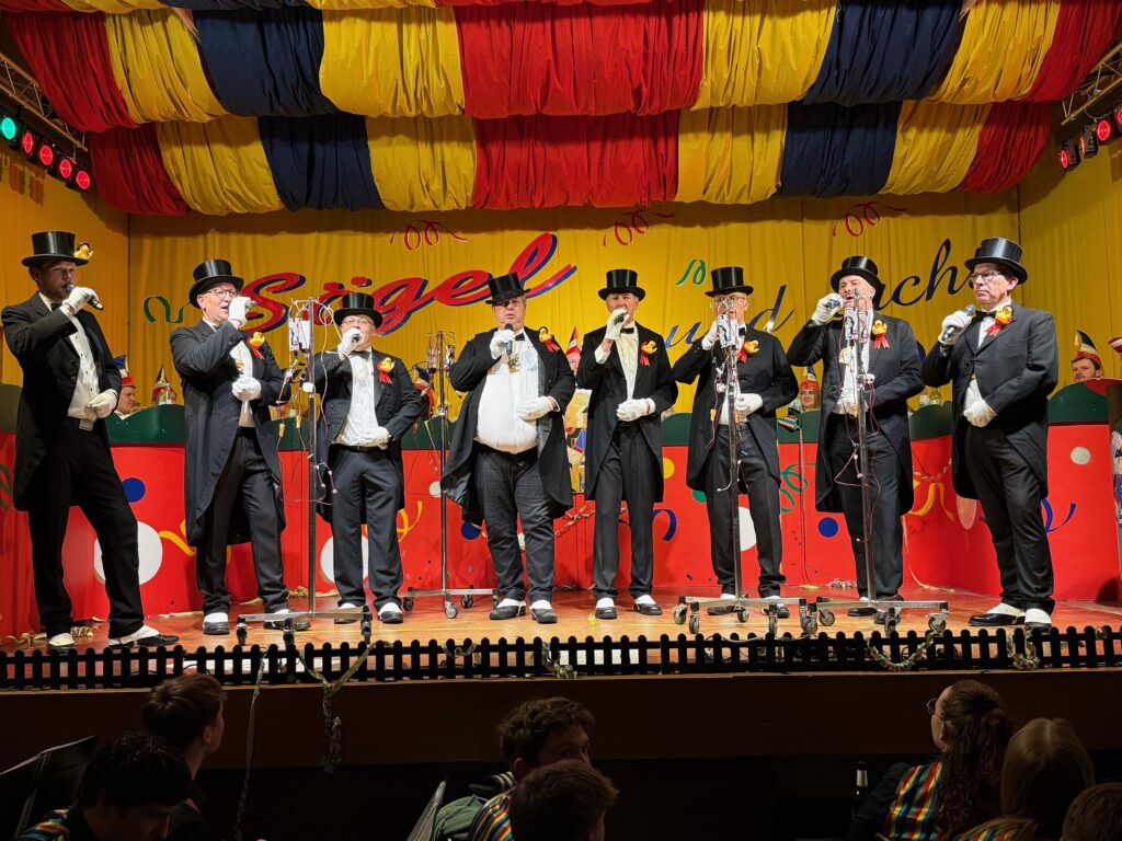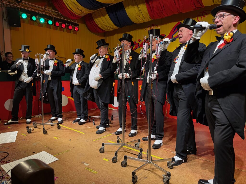 Die A-Capella-Sänger von „Leicht und Cross“ unter Jörg Christian Freese zelebrierten Songs wie „Kranke Männer“ am Tropf oder „appetitlich Fußnägel schneiden“ und die umjubelte Zugabe „Techno“. Eine besondere Ehrung gab es für Andreas LILLE Lipport, Wilhelm POWIE Meyer und Stephan Schmees für 40 Jahre im Karnevals-Männerchor.