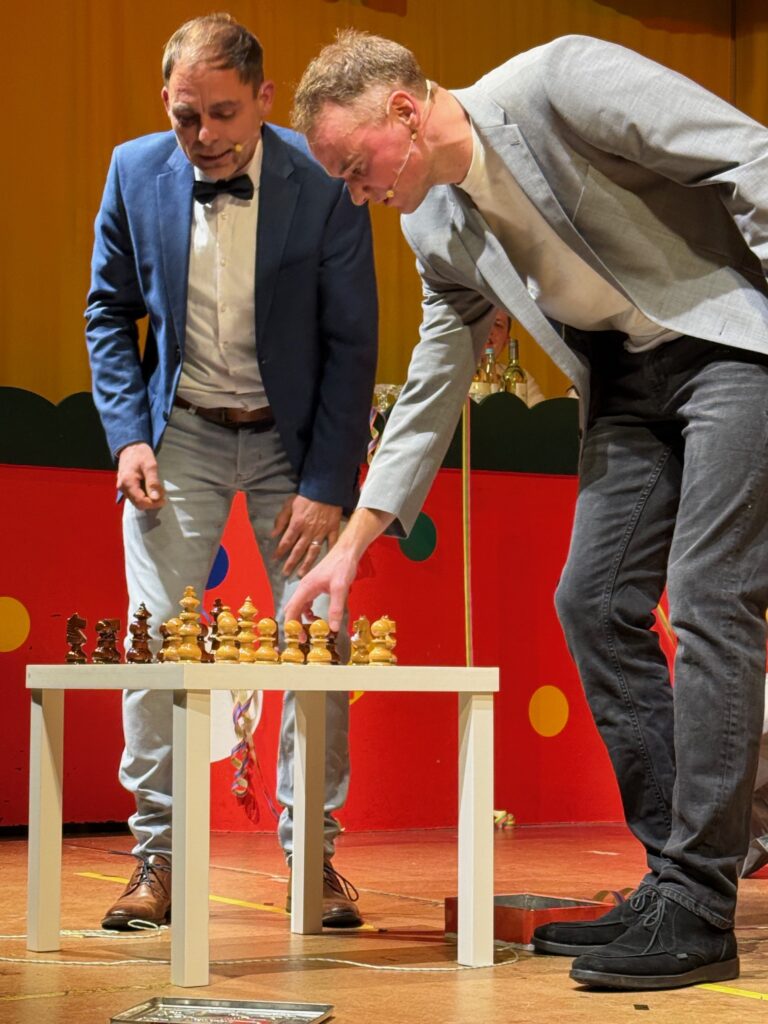 Eine komplett andere Darbietung brachte „La Tem“ wieder auf Luckys Bühne. Selektierte Requisiten: ein bodentiefes Schachspiel und großes schwarzes Klavier. Mit ihrem „Sekundenbruchteil-Witz“ bot das Gespann aus Christian Temmen und Marius Langen wieder eine exklusive Show.