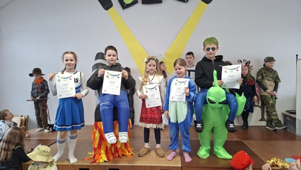 Ein besonderes Highlight war anschließend die Kostümprämierung in den Klassen. Hier wurden die originellsten, lustigsten und kreativsten Verkleidungen ausgezeichnet. Die Spannung war groß, als schließlich auch die Schulsiegerinnen und Schulsieger festgelegt wurden. Der Applaus war riesig und alle freuten sich miteinander.