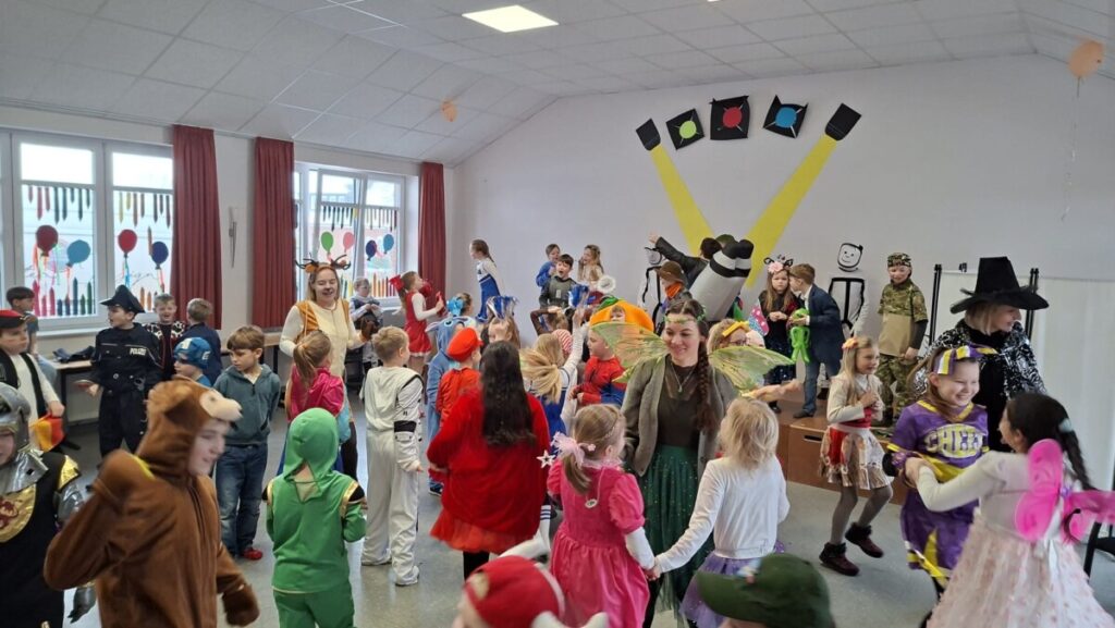 Zum krönenden Abschluss traf sich die gesamte Schulgemeinschaft im Forum. Dort verwandelte sich die Schule in eine fröhliche Kinderdisco. Bei lauter Musik wurde getanzt, gehüpft und mitgesungen. Die Stimmung war ausgelassen, und die tollen Tänze sorgten für beste Karnevalsatmosphäre.