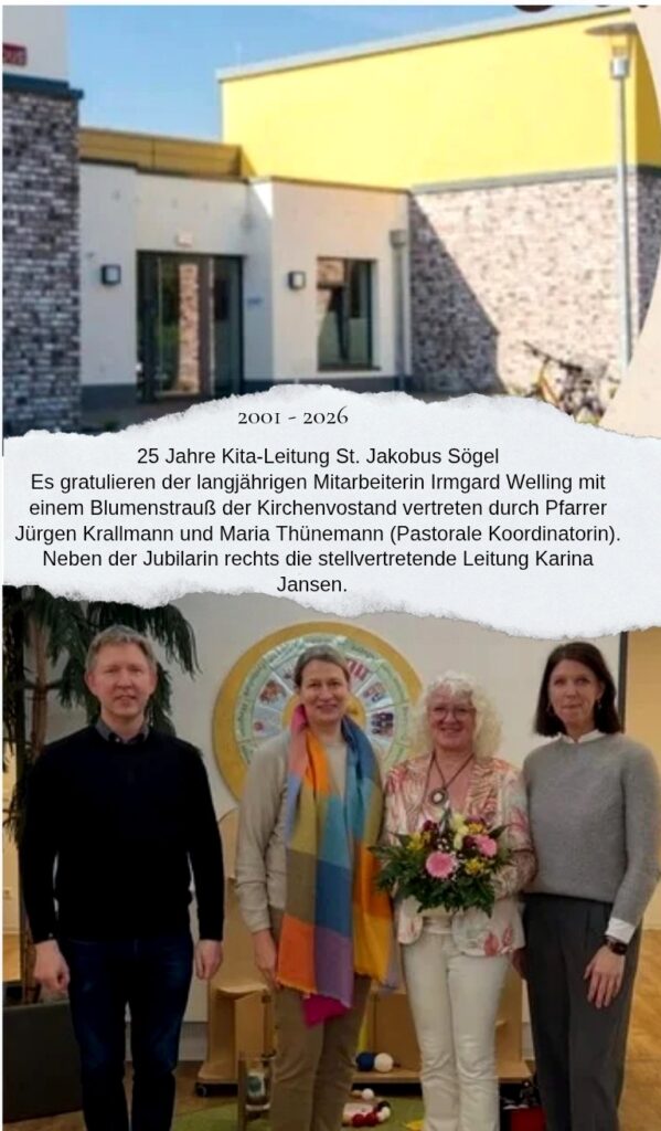 4. April 2026Sögel – Symbolträchtig wurde das Foto zum 25. Leitungsjubiläum vor dem gestalteten Herzensort in der KiTa St. Jakobus gemacht. Dieser Platz steht für religiöse Angebote im Kirchen- und KiTajahr. Ein Angebot, welches nicht zuletzt die Handschrift der Leiterin der Kindertagesstätte am Prinzenkamp in Sögel trägt.