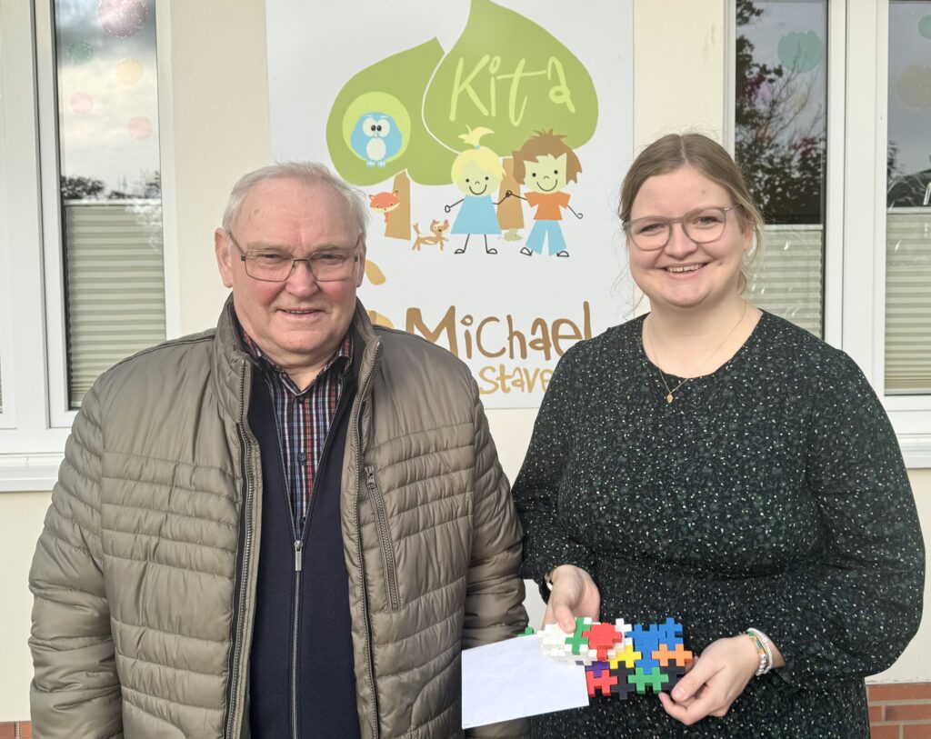 Stellvertretend überreichte Lambert Wester 400 Euro aus der gemeinsamen Kasse an Jennifer Knese, Leiterin des Kindergartens St. Michael in Stavern. „Wir hatten die Absprache getroffen, dass wir das angesparte Geld bei der Auflösung des Stammtisches einem guten Zweck zukommen lassen. Der Kindergarten in unserer Gemeinde ist, so glauben wir, die erste Adresse“, so Lambert Wester bei der Übergabe. Jennifer Knese bedankte sich und sicherte zu, das Geld entsprechend einzusetzen. „Wir werden Konstruktionsspielzeug, das zur Aktivierung der Feinmotorik und zur Förderung des logischen Denkens der Kinder beiträgt, davon kaufen“, so ihre Aussage.